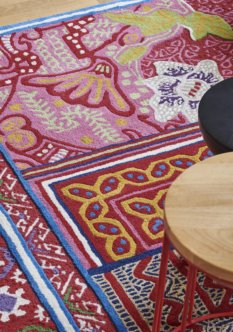 TAPIS BAYA to wyraz sztuki i tradycji inspirowany bogactwem wzorów block print z Radżastanu. Zaprojektowany przez Florence Bourel, ręcznie tuftowany dywan z wełny i jedwabiu roślinnego łączy w sobie intensywne barwy, luksusowe materiały i misternie utkane tekstury, wprowadzając do wnętrza ciepło, energię i elegancję.