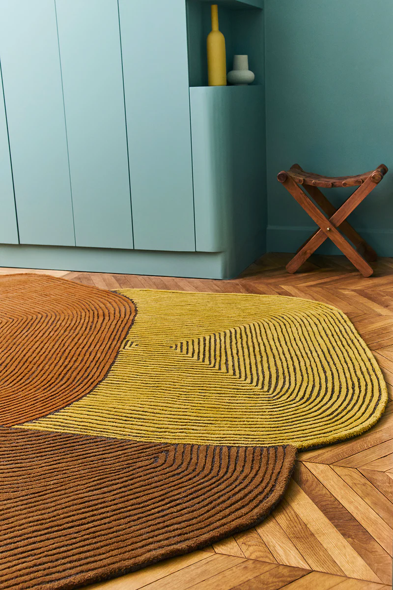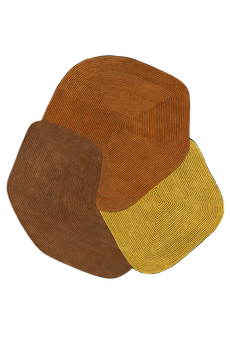 Tumulus to dywan, który łączy artystyczną wizję Samuela Accoceberry’ego z mistrzowską techniką tuftowania ręcznego. Jego organiczny kształt, przypominający trzy płatki, wprowadza do wnętrza harmonię i spokój, przyciągając wzrok ku centralnej części kompozycji. Wyrafinowane reliefy i faktury, powstałe dzięki precyzyjnej pracy indyjskich rzemieślników, nadają dywanowi zarówno głębię, jak i subtelny efekt wizualny przypominający ogród zen.