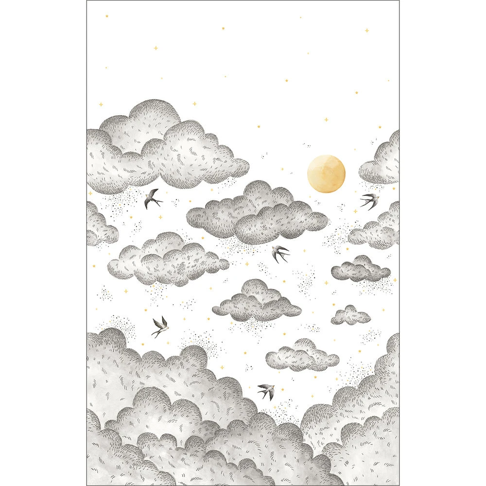 CELESTE NOIR to najbardziej poetycki z naszych panoramicznych murali! Ten wzór łączy delikatne chmurki i drobne ptaki na tle usianym złotymi gwiazdkami, tworząc marzycielską, wręcz bajkową kompozycję. Idealny do każdego wnętrza, od sypialni po pokój dziecka – obiecuje podróże w nieznane i chwile oderwania od codzienności.