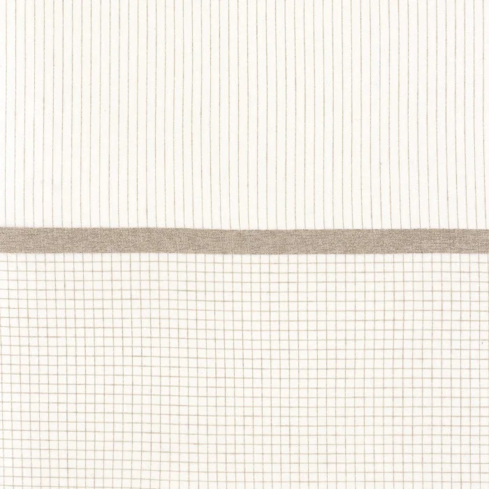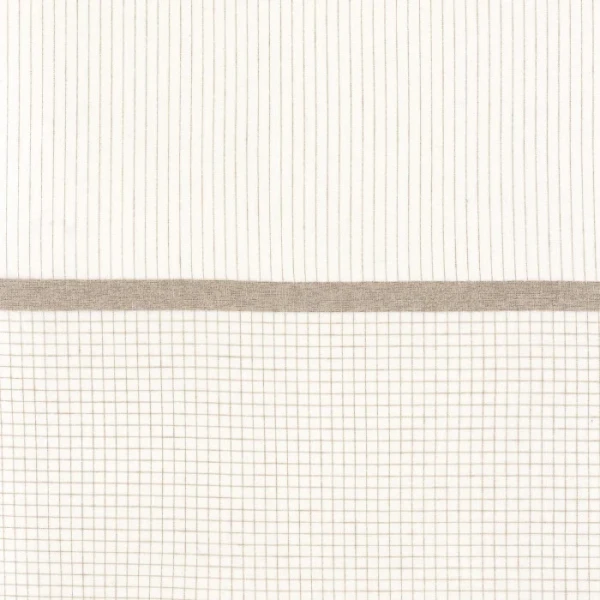 Panel tkaninowy MAI Camengo 38960152 to voile o wyglądzie lnu, tkane w formie paneli, z długimi, eleganckimi liniami na dwóch trzecich wysokości. Szeroki poziomy pas jest tkany z delikatnej przędzy bouclé, nadając materiałowi miękkość i naturalne odczucie. Baza voilu posiada subtelny, delikatny wzór w kratkę gingham. Ten panel jest miękki i ponadczasowy, wzbogacony o nutę oryginalności, zaprojektowany z szerokością 320 cm i zwisem 300 cm.