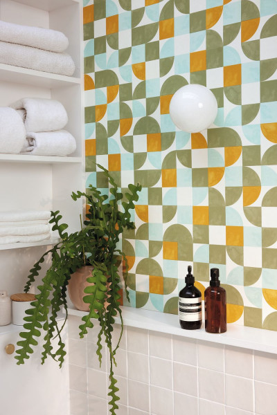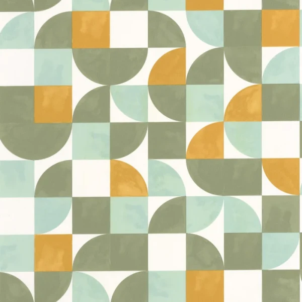 Tapeta HAPPINESS Caselio 2105360387 Oh happy days! Ten wzór HAPPINESS potwierdza naszą miłość do geometrycznych motywów z retro nutą. Co łączy go z naturą? Piękne odcienie zieleni — od aqua po zielono-niebieskie — oraz pięknie teksturowane wykończenie, przypominające liście.
