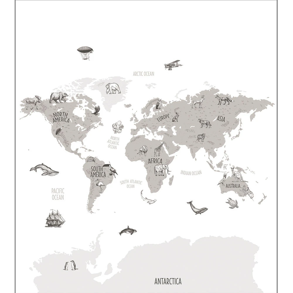 Tapeta PANORAMIQUE WORLD MAP NOIR / BLANC Caselio 102039918 to wyjątkowa dekoracja ścienna, która pozwala spojrzeć na świat wielkim planem. Dzięki tej panoramicznej mapie mamy możliwość podziwiać kontynenty i ikony zwierząt na jednej ścianie. Dostępna w nowoczesnych kolorach lub subtelnej wersji czarno-białej, idealnie pasuje do różnych stylów wnętrz. To doskonała mapa świata, która zachwyci zarówno młodych, jak i starszych odkrywców, przypominając jednocześnie, że świat jest ogromny, a jednocześnie kruchy.