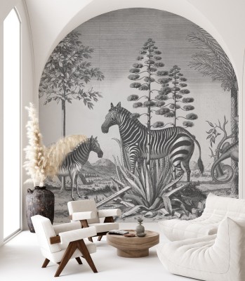 Tapeta Zebra on Agave Wallcolors TAP-7776 to monochromatyczny mural inspirowany techniką drzeworytu. Przedstawiona rycina ukazuje zebry w asyście Agawy na tle pejzażu z drzewami, tworząc wyrafinowany akcent, który doda charakteru każdemu wnętrzu. Wzór tak uniwersalny, że można ozdobić nim praktycznie każde wnętrze.