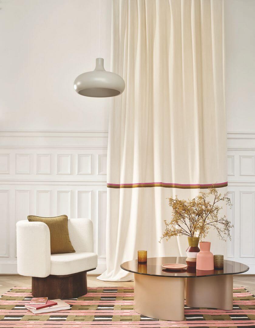 Tkanina Camengo Anemone o podwójnej szerokości, co pozwoli na wykorzystanie jej w charakterze stylowych zasłon. Bardzo dobrze sprawdzi się także jako poduszki ozdobne czy rolety rzymskie. Wykonana w 53% z poliestru pochodzącego z recyklingu i w 47% z poliestru, zastosowana przędza jest lekko pętelkowa, dzięki temu tkanina zachowuje niezwykłą miękkość i jest przyjemna w dotyku. Ten jednolity wzór występuje w wielu odsłonach kolorystycznych, spotkamy tu kolory inspirowane ziemią oraz minerałami. Tkaniny jednokolorowe wspaniale odnajdują się w minimalistycznych wnętrzach oraz nieco bardziej finezyjnych aranżacjach.