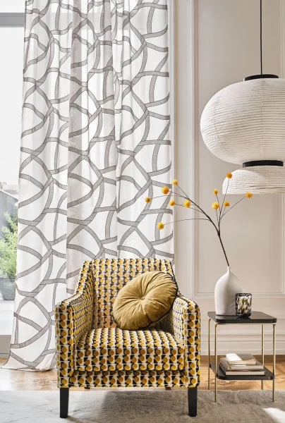 Tkanina Camengo Boomerang Faisceau to tkanina z graficznym wzorem i zakrzywionym ruchem, haftowana na woalu przypominającym len, który jest jednocześnie lekki, przewiewny i nowoczesny. Projektowany w podwójnej szerokości, lub podwójnym spadku, jeśli preferujesz wzór w drugą stronę. Faisceau łączy w sobie elegancję i funkcjonalność, tworząc tkaninę, która jest zarówno piękna, jak i praktyczna. Ta tkanina jest idealna do tworzenia wyjątkowych i osobistych przestrzeni.