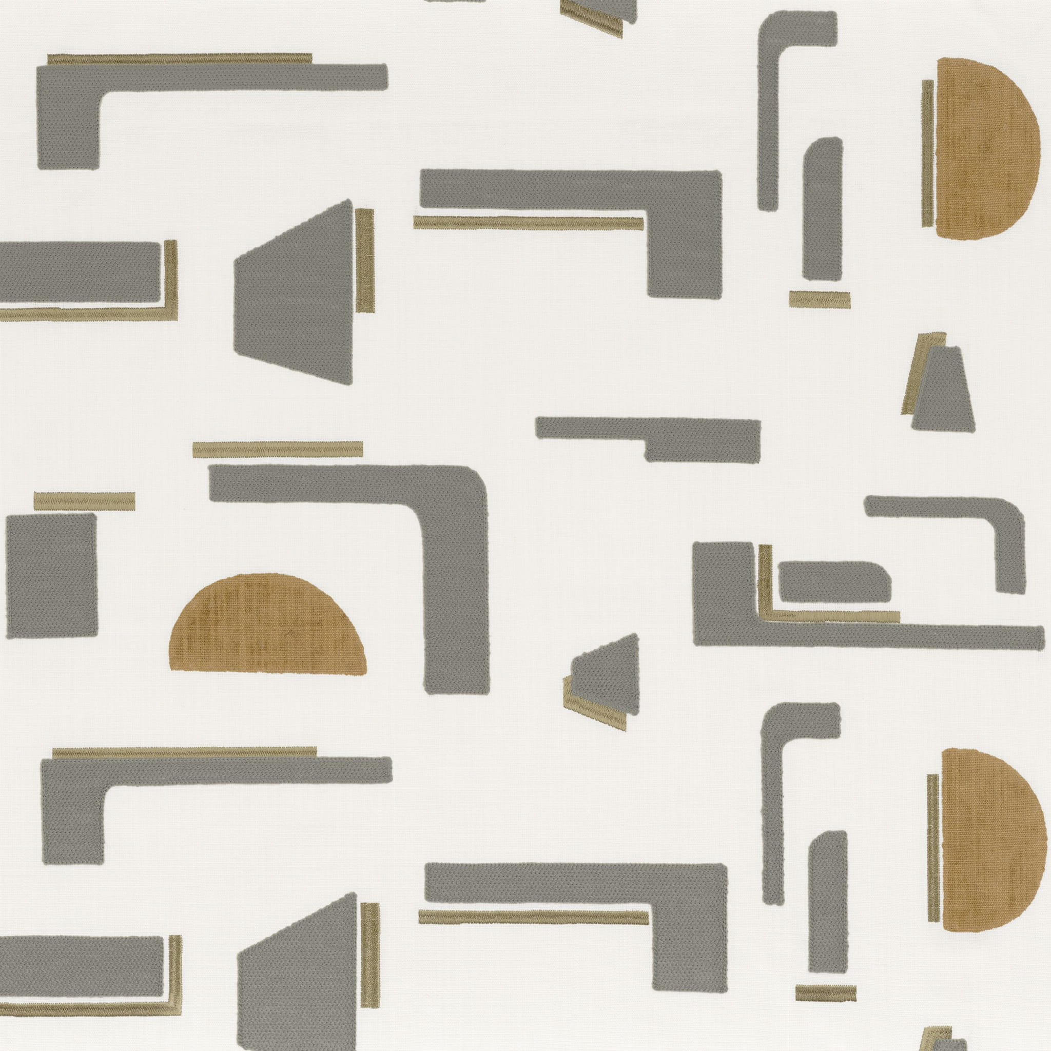 Wspaniały haftowany i drukowany materiał ISOTOPE zachwyca bogatym i subtelnym wzorem graficznym. Geometryczne motywy są ozdobione dwoma różnymi ściegami i rodzajami nici: pierwsza, o wyglądzie bawełny i wełny, jest haftowana bardzo gęstym ściegiem łańcuszkowym, nadającym niezwykłą objętość. Druga, o jedwabistym wyglądzie, została wykonana eleganckim ściegiem satynowym. Ręcznie wykonany nadruk blokowy, który tworzy wzór, został dodatkowo podkreślony złotym atramentem. Połączenie różnych wzorów i technik tworzy kontrastujące faktury, które pięknie odbijają światło, nadając tkaninie wyjątkowy charakter.
