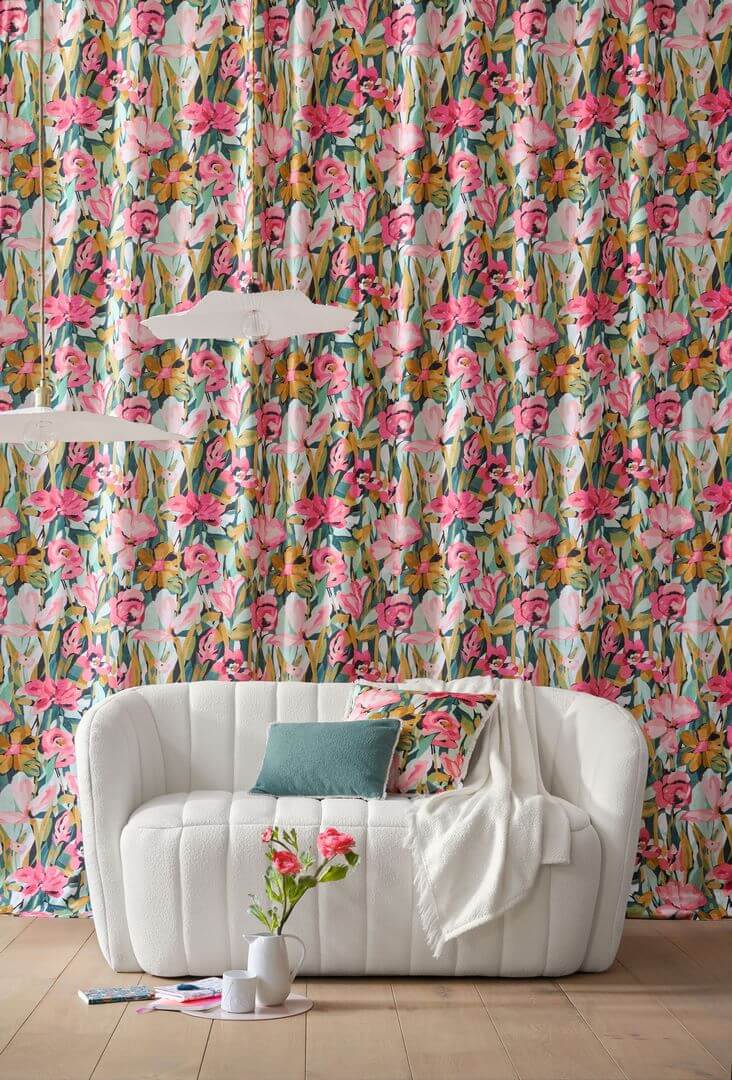 Naturalna tkanina ze wzorem akwarelowych kwiatów przypomina obraz francuskiego malarza Matisse'a. Mieszanka wiskozy i lnu z przepięknym wzorem, który przypomina polne kwiaty, doda aranżacjom lekkości. Piękne kontrasty ujawniają świeży charakter tej kwitnącej roślinności. Wzór jest szczególnie odpowiedni do miękkich zasłon lub ozdobnych siedzisk o wyrazistej i zabawnej osobowości. Bardzo dobrze sprawdzi się także jako rolety rzymskie lub poduszki ozdobne. Wyjątkowy wzór o kwiatowym wzorze, w kolorowych barwach występuje w dwóch odsłonach kolorystycznych, pochodzi z katalogu Alpilles, od francuskiej marki Camengo. W kolekcji znajdują się przepiękne tkaniny przeznaczone do eleganckich i stylowych wnętrz. Roślinne wzory oraz geometryczne kształty doskonale się ze sobą łączą i pozwalają stworzyć wyjątkowe miejsca z francuskim charakterem. Delikatne hafty, efekt satyny, miękki aksamit czy pikowane wzory dodadzą wnętrzom ciepłego oraz przytulnego charakteru. Niektóre projekty będą doskonałymi zasłonami i poduszkami, inne natomiast sprawdzą się jako obicie pufy czy kanapy.