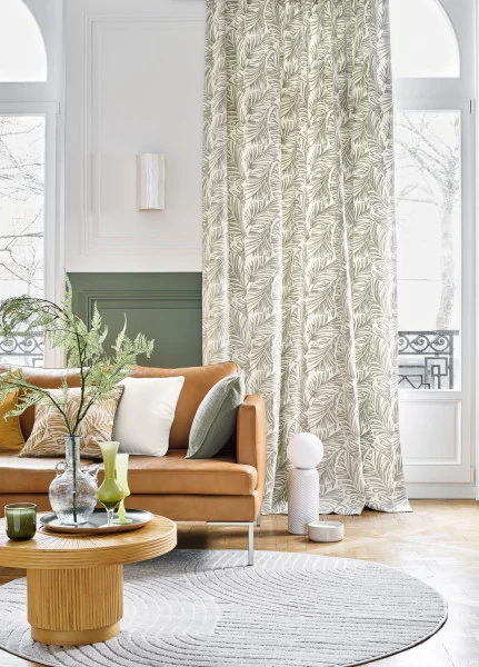 „VIVACE” sugeruje zreinterpretowaną roślinność lub stylizowane pióra w abstrakcyjnym, ozdobnym stylu. Ich wyrafinowany ruch tworzy piękne krzywe na elastycznej tkaninie poliestrowo-bawełnianej. Kolory inspirowane naturą: perłowy i mechowy na białym tle lub camel i biały na tle lnu.